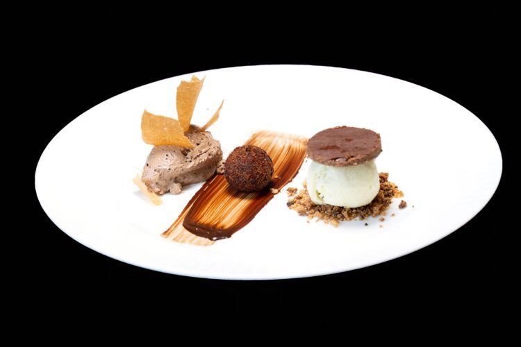 Et pour clore le repas, une composition autour de la Poire, feuillantine, sorbet cacao, mangue, passion, ananas meringue ou les fromages “Le bonheur est dans le pré”, servis avec pain maison et miel du pays.