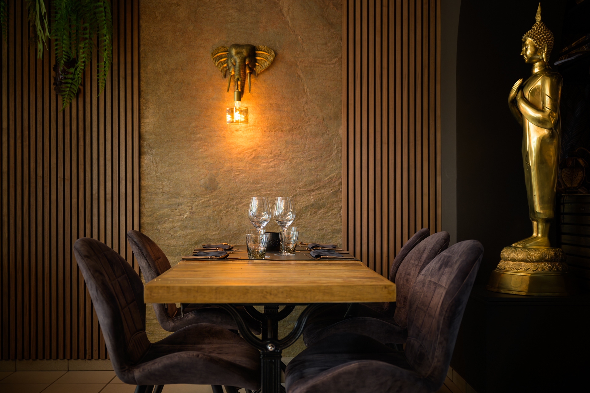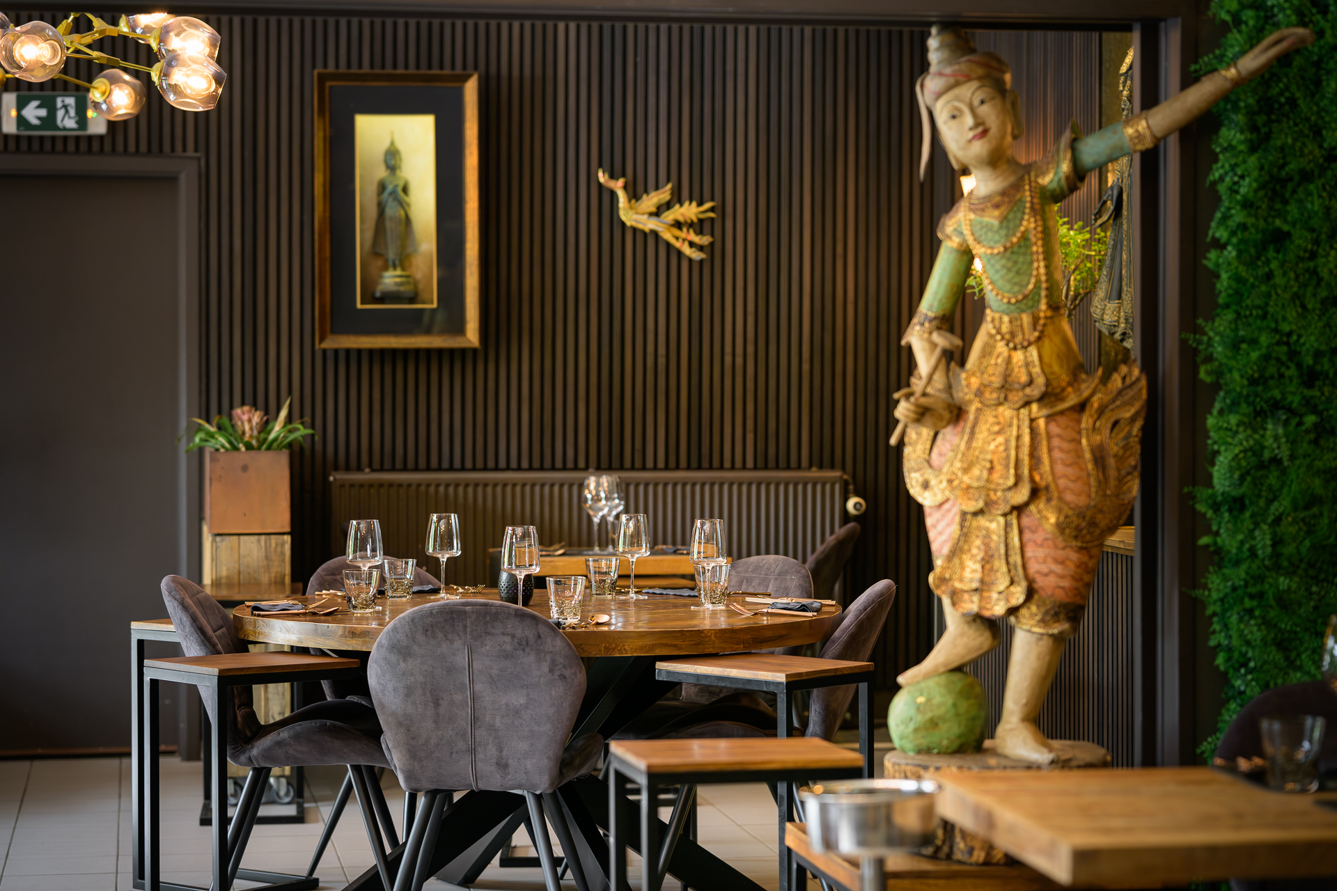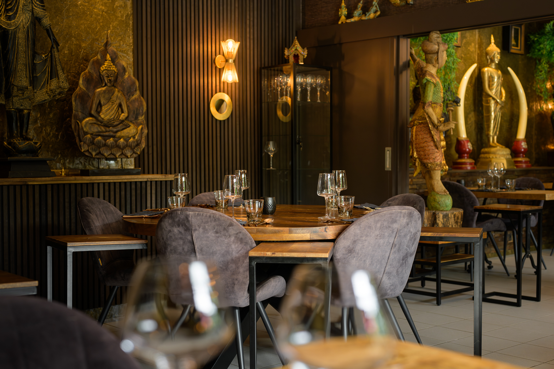 Après plus de neuf années passées en périphérie de Ciney, François Grégoire et la cheffe Panya Chaiwari ont choisi de poser leurs talents au cœur du Condroz liégeois, dans une maison de caractère, taillée pour l’hospitalité. Ici, la Thaïlande se découvre bien avant la première bouchée : sculptures en bois tropical, statues de Bouddha, peintures d’Extrême-Orient et lumières feutrées composent un décor raffiné qui invite au dépaysement.