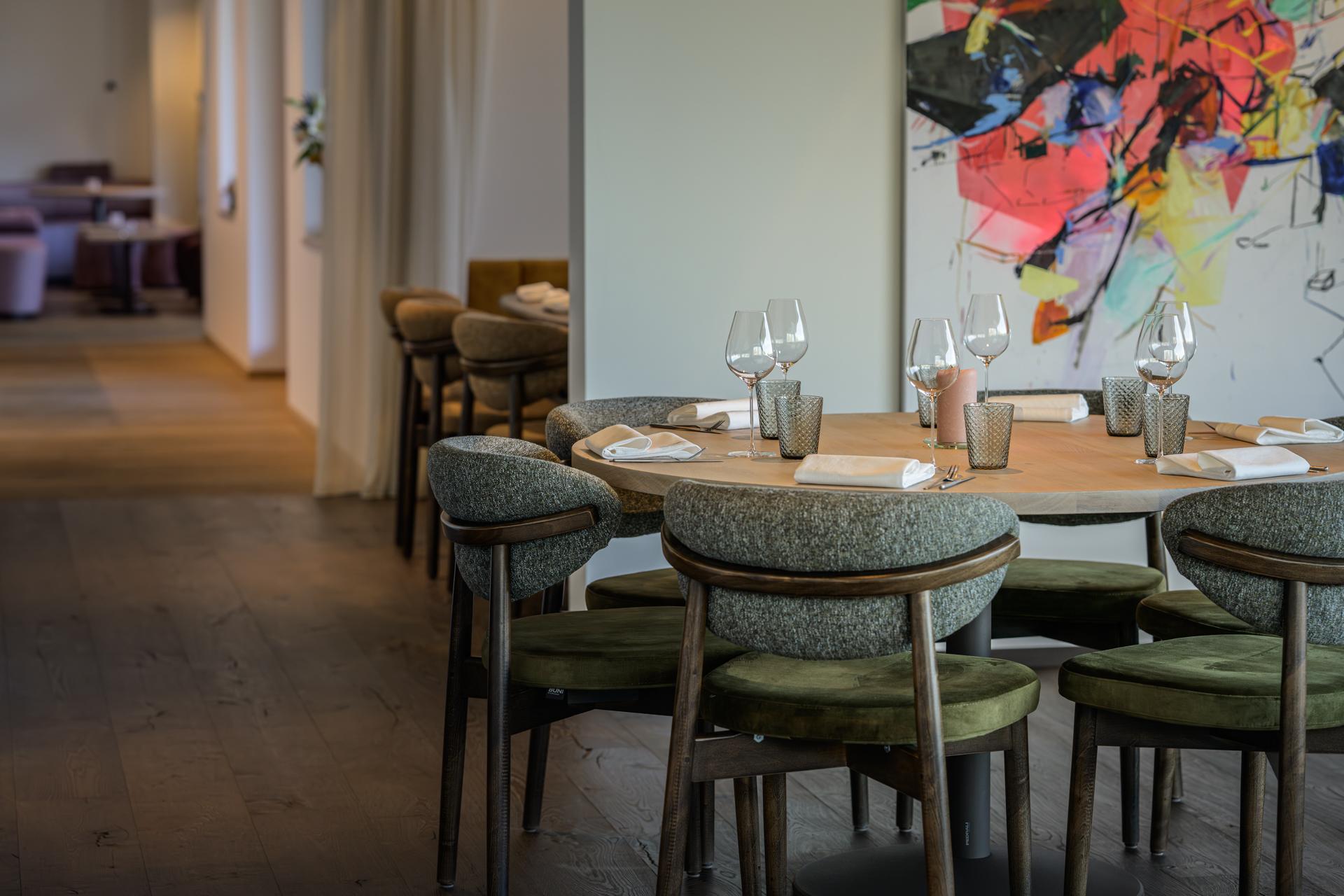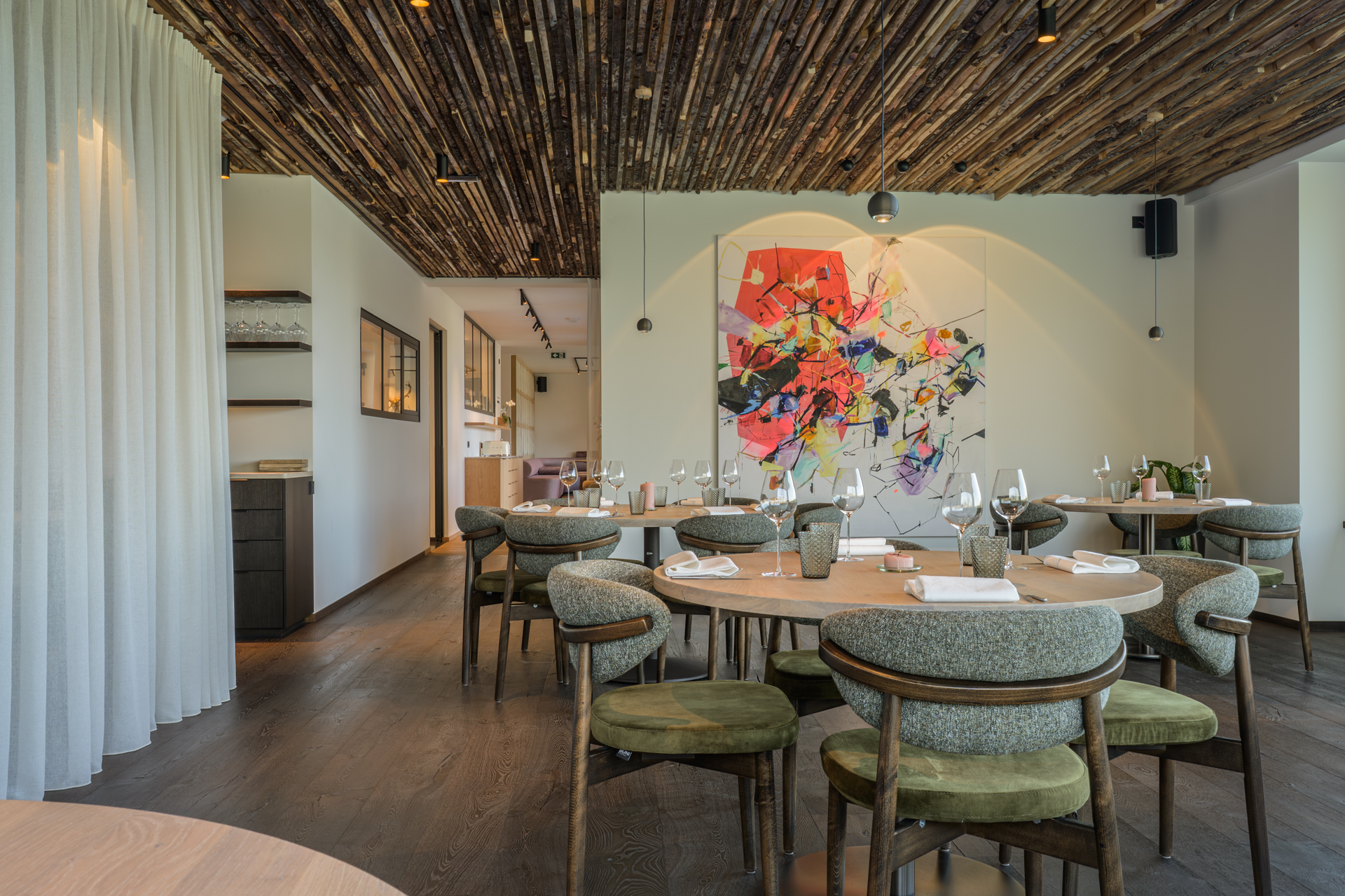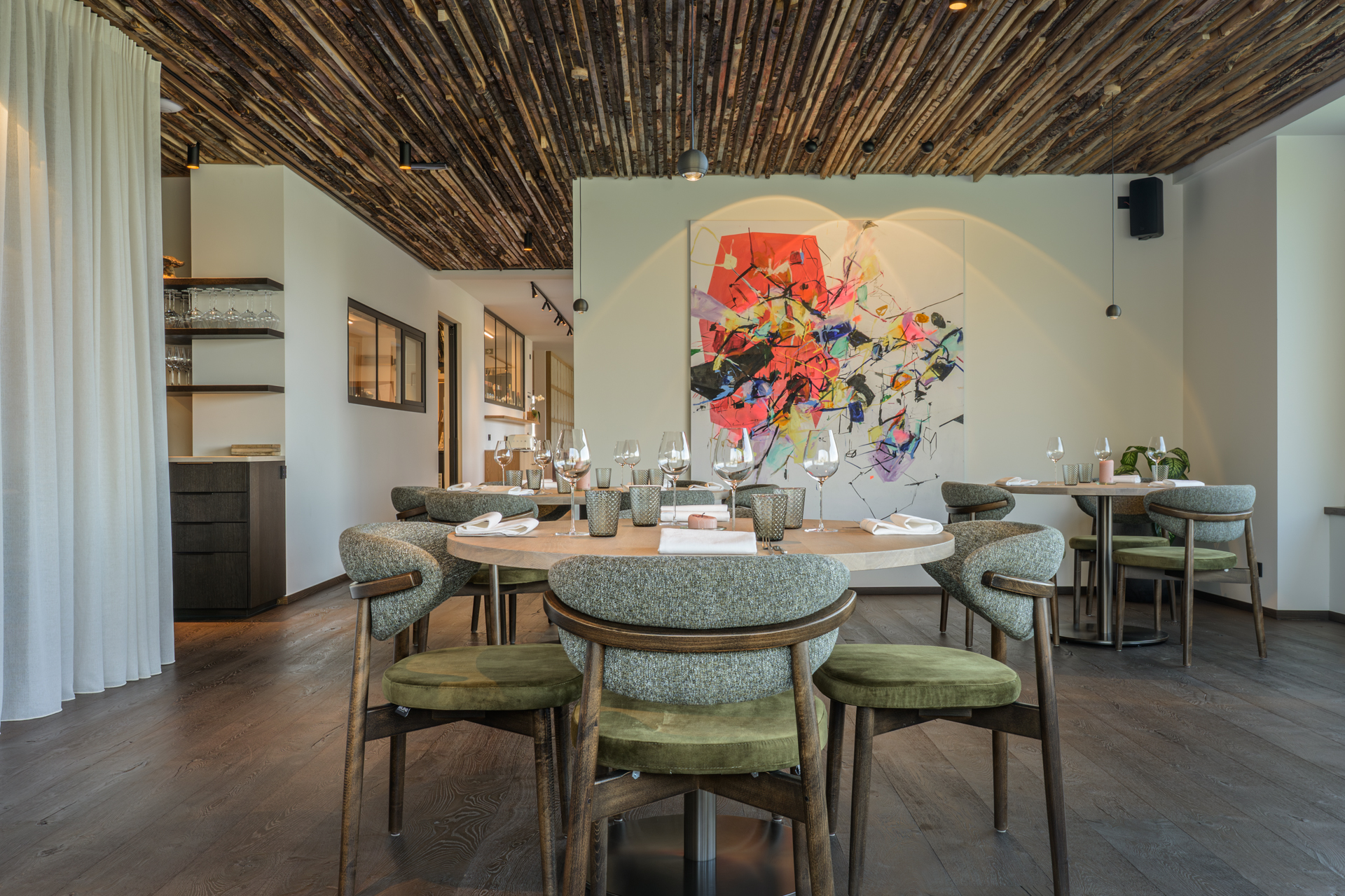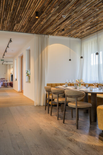 Le repas s’ouvre au salon, près du feu qui murmure, puis on glisse doucement vers la salle à manger, où le bois enveloppe, respire, et laisse circuler une vie calme, presque imperceptible.