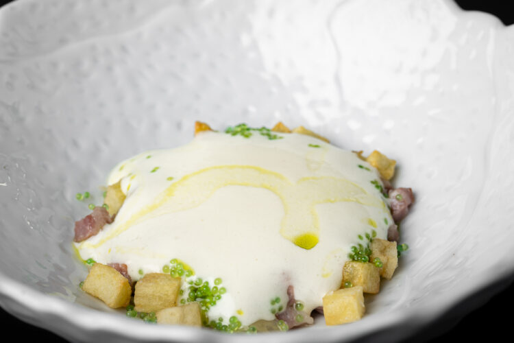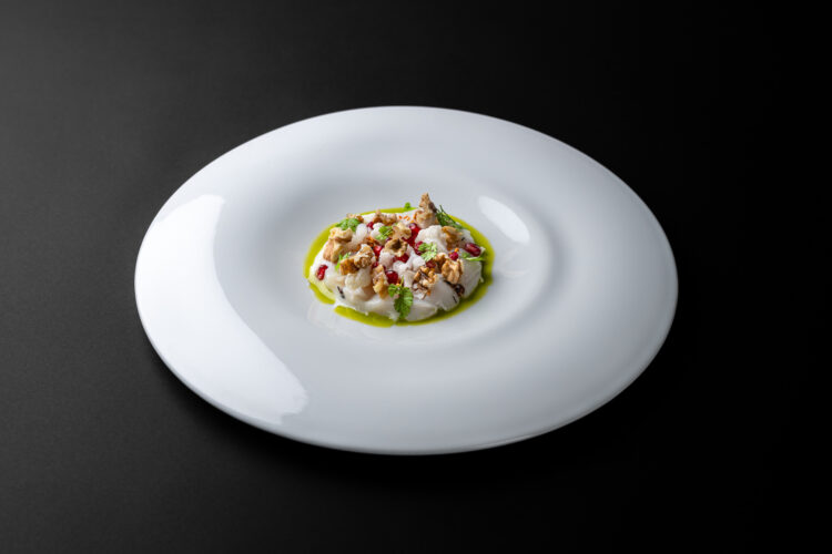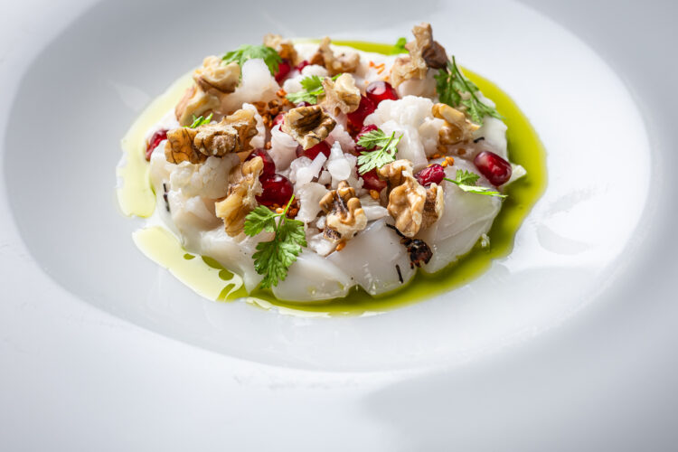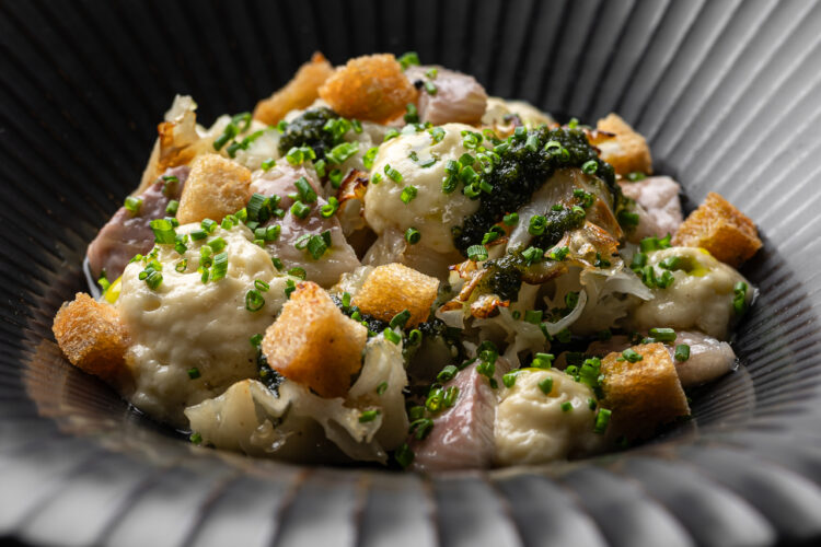 La mer revient avec un Cabillaud nacré : fregola au parmesan, nuage d’oseille, chou kale beurré, chips de salsifis. Une assiette claire comme un matin d’hiver.