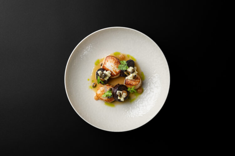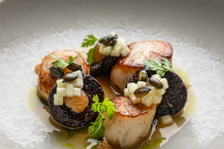 Puis viennent les Saint-Jacques, rôties juste ce qu’il faut, frôlant le noir du boudin Boca. La Granny illumine, le coing adoucit, le beurre blanc aux pommes tardives apporte la juste nuance.