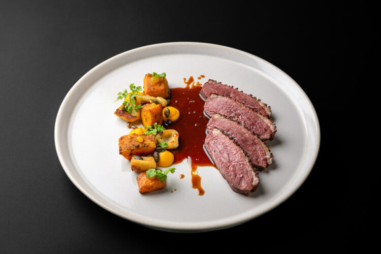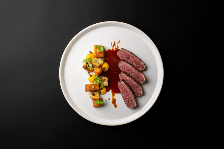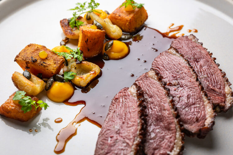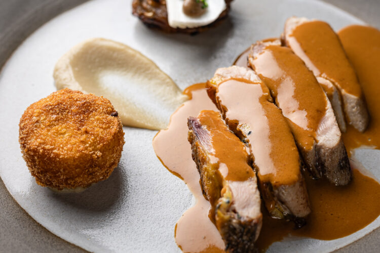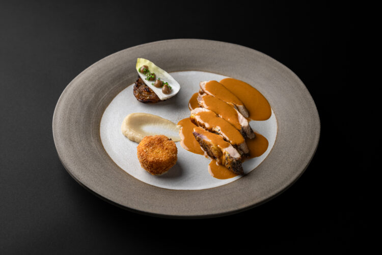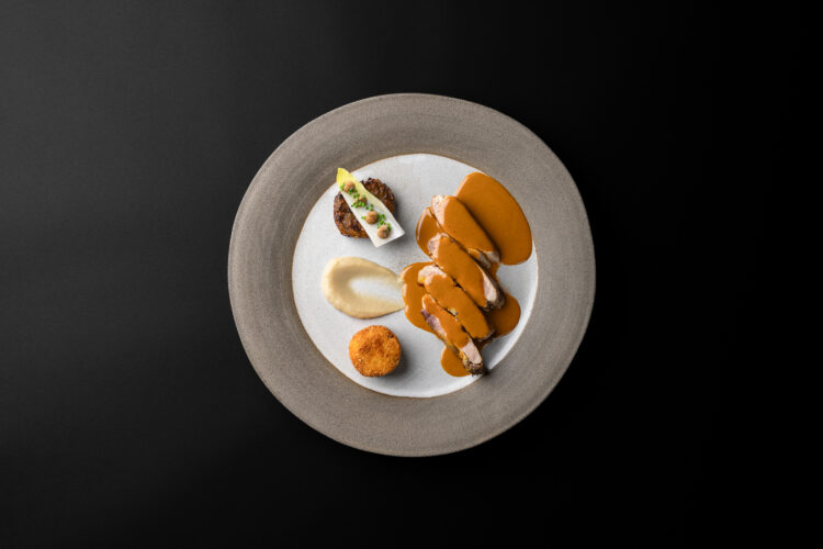 Le Faisan prend ensuite place, tout en douceur : panais au café, tatin de chicon, ail noir, croquettes aux noisettes ; et cette Brabançonne, une sauce qui parle de chez nous.