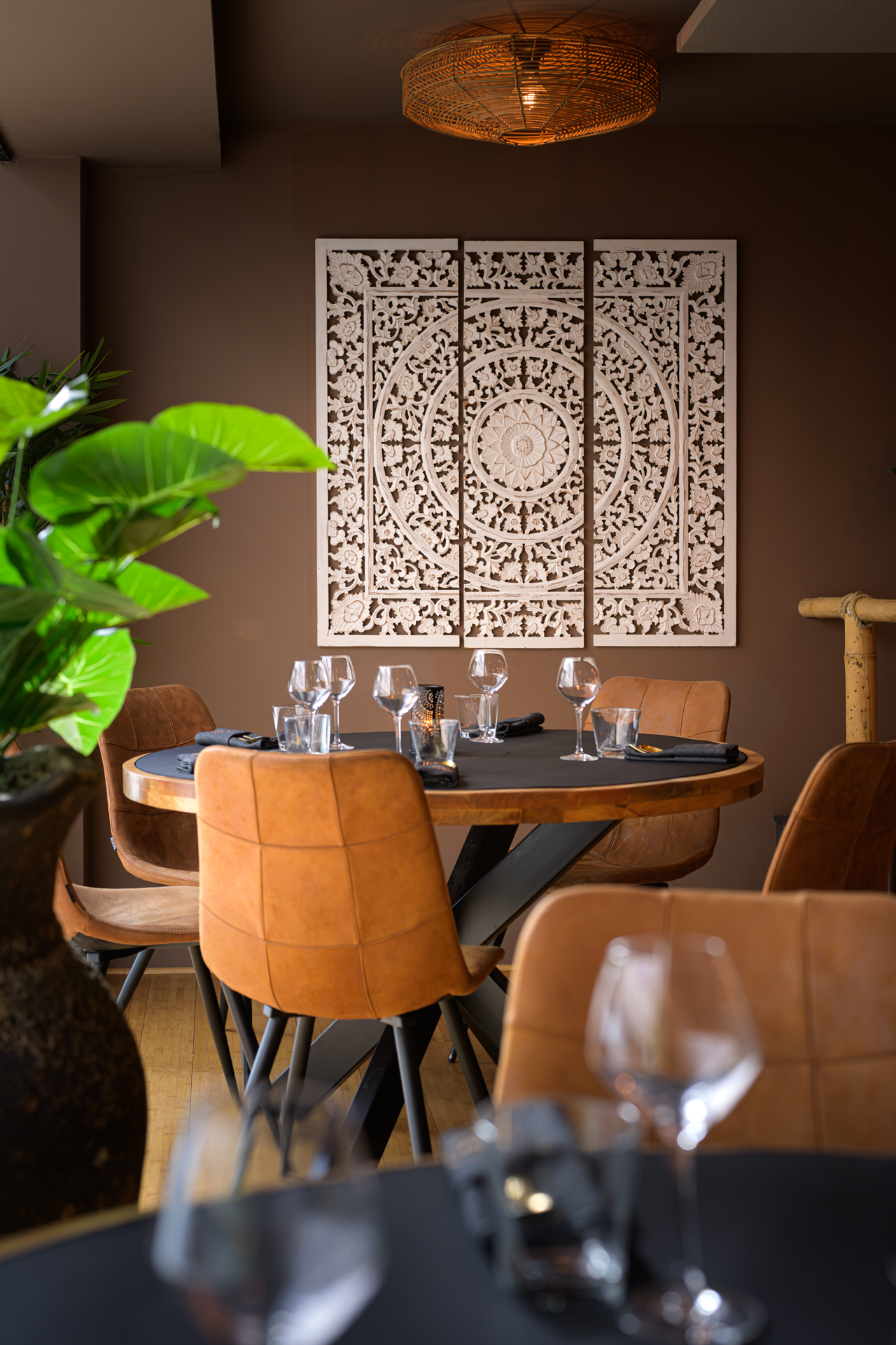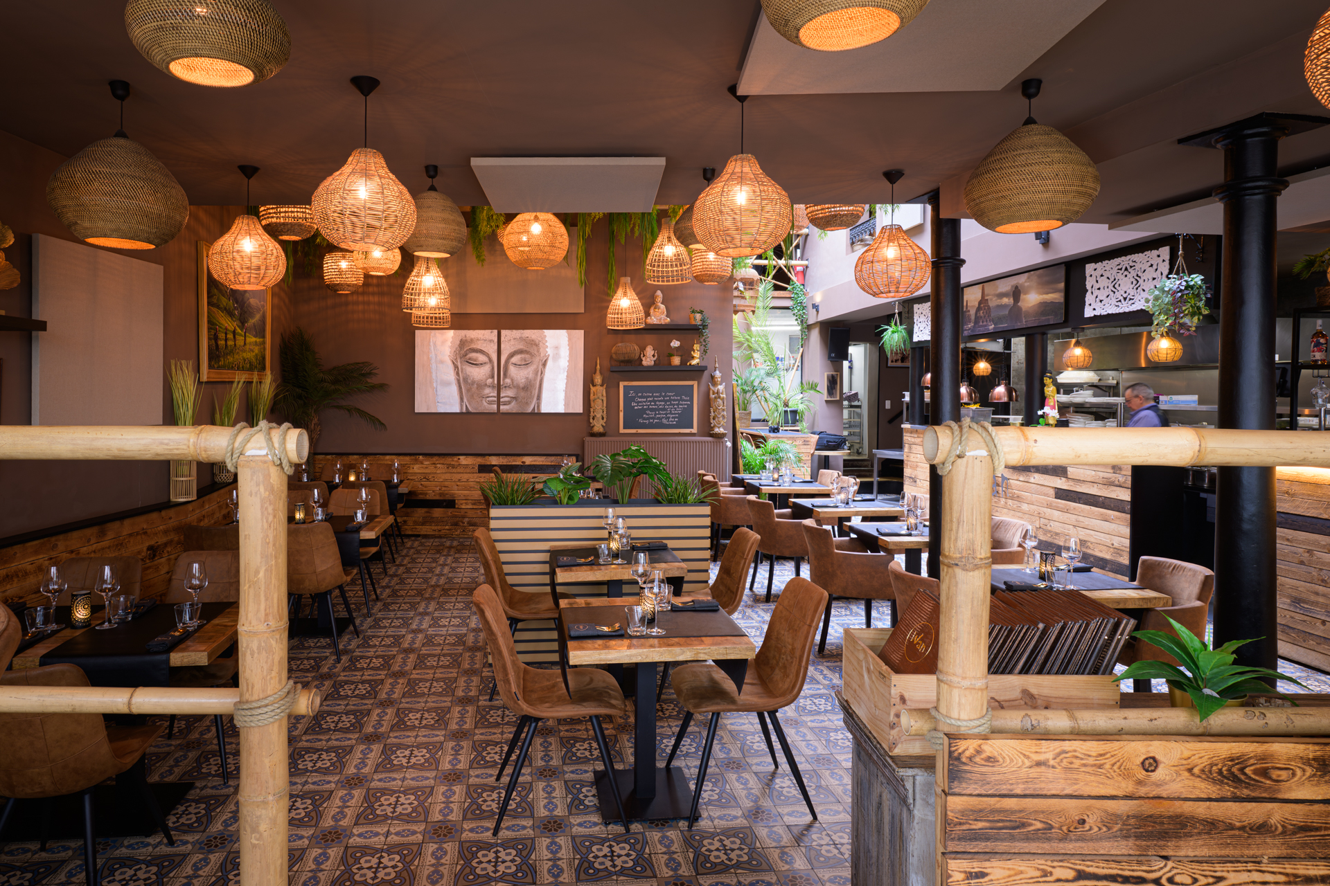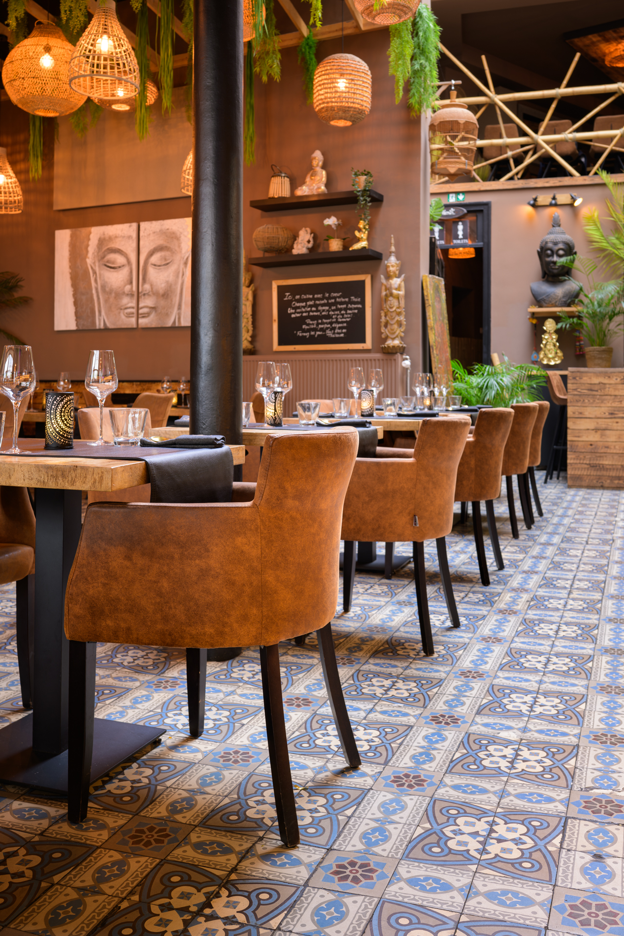 Entrer chez Wan Thaï Food, c’est franchir un seuil invisible. Celui qui, sans bruit, vous transporte ailleurs. Bangkok n’est pas loin, elle affleure dans les détails, dans la lumière qui tombe doucement, glisse sur les boiseries, s’attarde sur le carrelage lustré, accroche un abat-jour d’osier, puis se pose, paisible, sur un bouddha silencieux. Ici, tout semble pensé pour ralentir le regard, apaiser l’esprit, avant même que les sens ne s’éveillent.