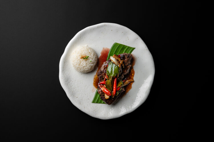 Puis la cuisine gagne en intensité. Le Pla Mannao, filet de bar vapeur, séduit par la netteté de sa cuisson et la vivacité de sa sauce au citron vert, citronnelle, coriandre et piment. Le Chuchi Nua Yang, entrecôte d’Angus maturée, s’inscrit dans une gourmandise plus profonde, enveloppée d’un curry traditionnel maîtrisé, sans jamais alourdir.